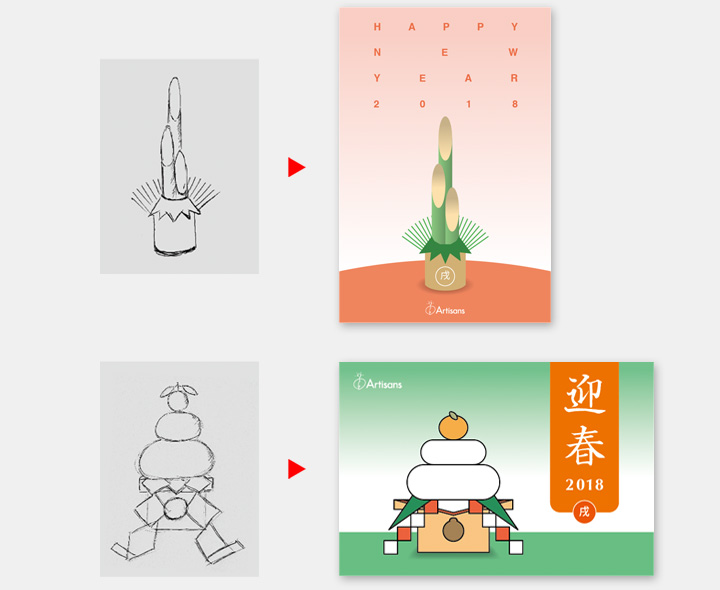 「お子様が描かれた絵」や、「お客様のアイデア(鉛筆ラフ)」を弊社デザイナーが「トレース」し、年賀状デザインを制作させて頂きます。トレース費用は、簡単なもので「5,000円〜」、複雑なモチーフの場合「10,000円〜」にて、ご対応させて頂きます。(とてもシンプルなものについては、「2,500円〜」等、内容を拝見させて頂いた上で、お見積りを出させて頂きます。)