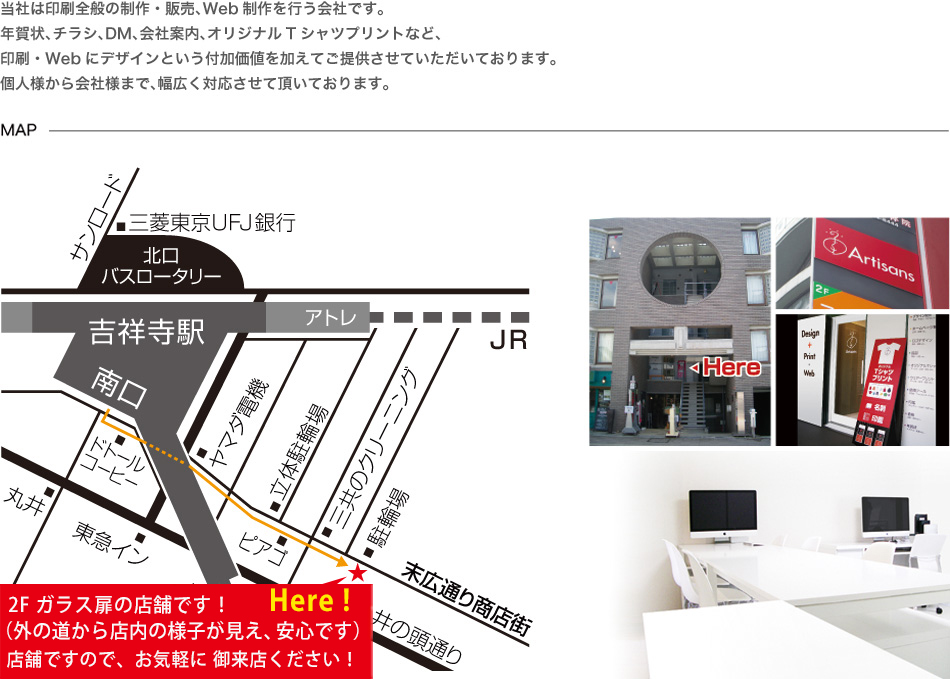 当社は印刷全般の制作・販売を行う会社です。あなたはアイデアをお持ち頂くだけ。面倒なデザイン、版下制作から印刷製本まで、当社が行います。個人ユーザーには楽しいビジュアルライフを!会社、お店の有効な宣伝物を!提供するパートナーとして、お気軽にご利用下さい。「アクセス」〒180-0003 東京都武蔵野市吉祥寺南町1-2-3 JR・井の頭線「吉祥寺駅」南口(公園口)より徒歩30秒 営業時間10:00〜18:00(平日)/10:00〜17:00(土・祝日/日曜休業)